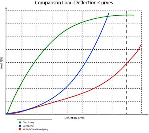 Wave springs load more linearly. The force-deflection curve for a multi-turn wave spring is linear, between 30% and 70% deflection, in contrast to the progressive behavior of coil and disc springs. Linear behavior lets designers more accurately dial in spring force, for instance to preload a seal without excessive wear. |
