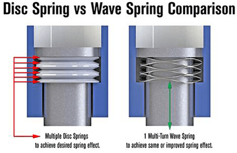 Wave springs have less wear and fatigue. Other sources of wear in springs include edge wear in disc springs and weld failure under dynamic loading in welded washers. Wave springs, on the other hand, have wide radial surfaces and shimmed ends for wide bearing surfaces, both of which minimize fatigue and wear. |